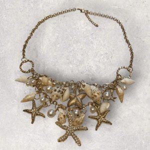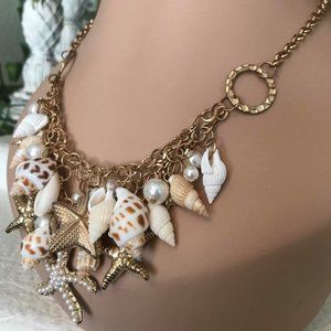 Looking for a lovely summer accessory? A bib-style necklace with seashells and beach-themed ornaments would be perfect for adding a touch of seaside charm to any outfit. The chain length of 20" with a 1 inch extender gives some flexibility in how the necklace can be worn, allowing it to be slightly adjusted to fit different neck sizes. With the charms hanging at about 3", the necklace will likely sit just below the collarbone and draw attention to the neckline making it a great statement piece. Overall, a bib-style necklace adorned with seashells and beach-themed ornaments is a fun and playful way to embrace the summer season and add some personality to your wardrobe. Great for a Luau themed party!
