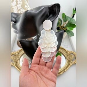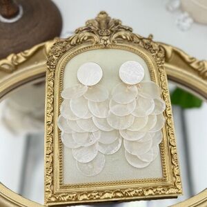 ke a bold yet effortlessly chic statement with these stunning layered shell disc earrings. Featuring cascading shell circles in an iridescent white finish, these earrings bring beachy elegance to any outfit – whether you’re dressing up a summer dress or adding flair to a simple tee.