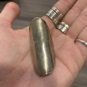 Amazing piece handmade in London. Size 10, roughly. Scratches across the face, which you can see in the photos. Back is a small band that loops all the way around.