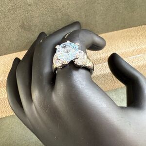 Statement Silver Tone Ring Large Blue Stone Round Cut Side Accents Size 9