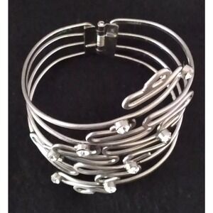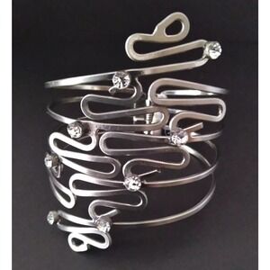 For those who are looking for an elegant and unique addition to their outfit, or jewelry collection, this bracelet is a statement piece. With four stands of silvertone metal round in the back with a swirlded snake like pattern in the front. It is adorned with rhinestones, creating a dazzling effect..