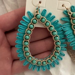 Beautiful blue statement earrings. Earrings have a turquoise and opal coloring with fringe like detail on the outside and a pretty beaded design on the inside. New with tags and great for summer! Comes with dust bag