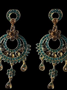 Elegant gold-tone chandelier earrings with green crystals. Sparkling green accents creates an eye-catching shimmer. Lightweight design for comfortable all-day wear. Perfect for dressing up evening and special occasion looks.