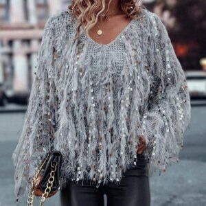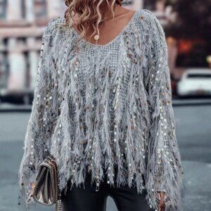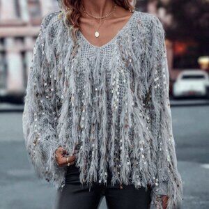 Statement maker! gray long sleeved fringe details V-neck Knit Sweater top