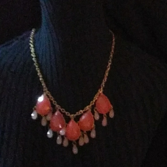 Accent your wardrobe with this lovely adjustable necklace. It can also be adjusted to a choker. Gold tone chain. Peach color stones.
