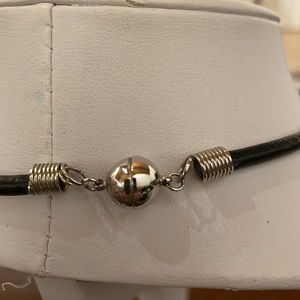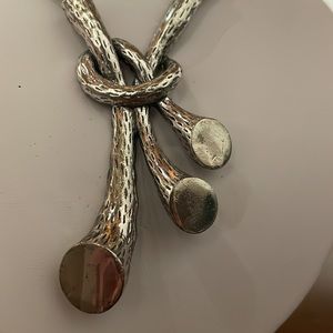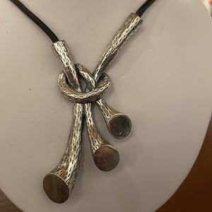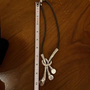Unique silver pendant on leather rope. Drop is around 7” from magnetic clasp, pendant is large (2”x4”)