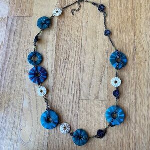 Handmade bronze-colored necklace with blue and green circular beads with ribbons.