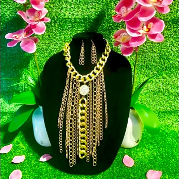This beautiful gold statement piece is of high quality for costume jewelry! Gold plated necklace set with matching fringe earrings!
