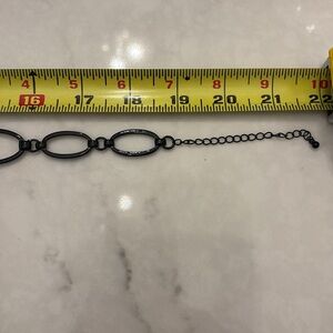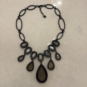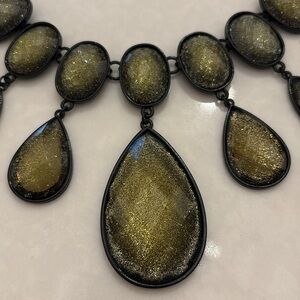 This statement necklace features shimmery greenish/golden, oval and teardrop rhinestones in a gunmetal setting. Adjustable. Very good condition!