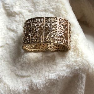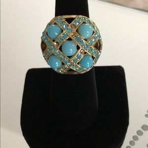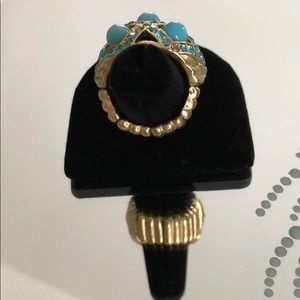 Expandable faux stone ring. Turquoise stones on gold tone ring. Ring face is about 1 1/2” wide