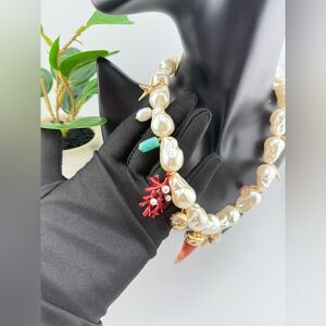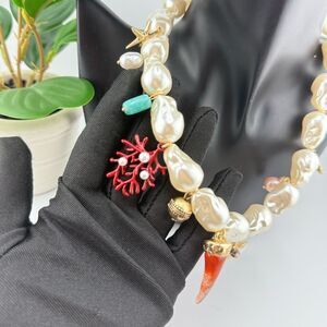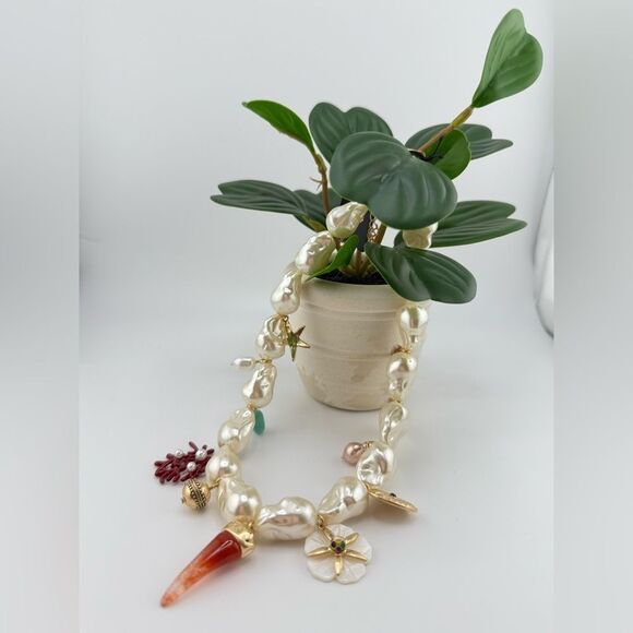 Turn heads and spark conversations with this one-of-a-kind statement necklace, crafted with irregular baroque-style pearls and adorned with an eclectic mix of bold charms. Featuring a coral red spike, delicate floral, gold-toned coin, sea star, and gemstone-inspired charms, this piece brings together coastal charm with avant-garde elegance.