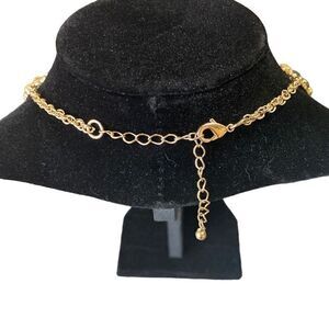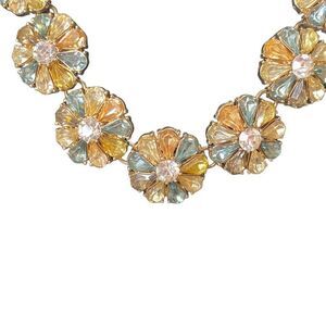 Beautiful statement necklace in gold tone with flower shapes in green, yellow, peach, and white rhinestones. Adjustable length from 16.5” to 19.5”. Could also connect at 14” for a choker. The flower shapes are each approx 7/8” in diameter.