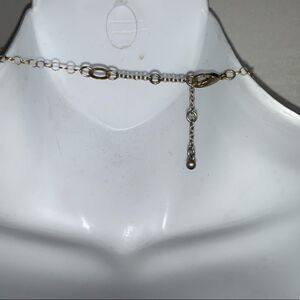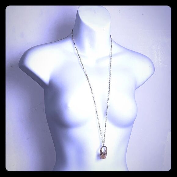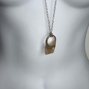 Gold tone long chain with abstract style ring pendant with beige rectangular stone.