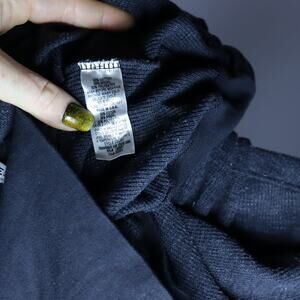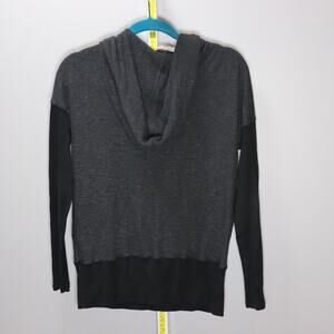 Stateside long-sleeve mixed-fabric hoodie in a charcoal gray body with black knit sleeves and hem. Soft, lightweight, and made in the USA. Features a slouchy hood, contrast fabrics, and a front patch pocket. Note: small stitching damage on the pocket (shown). Otherwise in good wearable condition.
