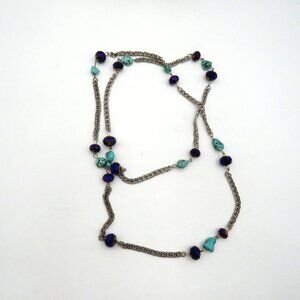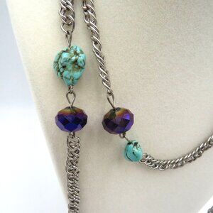 Station Bead Necklace 42" Long Silver Tone Chain Turquoise Faceted Blue Beads
