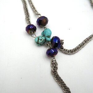 This necklace features a silver tone chain adorned with blue beads, complemented by turquoise accents, adding vibrant detail to any look.