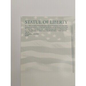 The text describes the Statue of Liberty and its features. Visitors can climb to the crown of the statue, which has 25 windows representing gemstones and symbolizes the rays of the heavens shining over the world. The seven rays of the crown represent the seven seas and continents. The statue holds a tablet in her left hand with the date "July 4th, 1776" written in Roman numerals. The text also mentions the photographer and includes information about the printing process.
