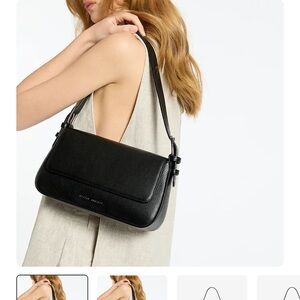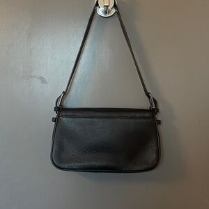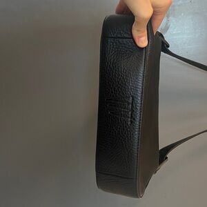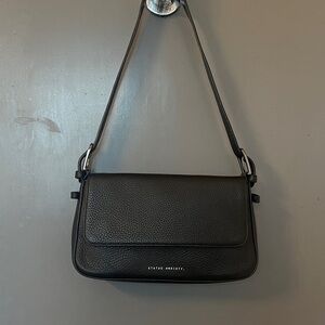 Minimalist black leather small east west shoulder bag excellent used condition. Hidden magnetic flap closure. From status anxiety 2024 collection. Retails for $250. Embossed logo on bottom of bag (pictured).