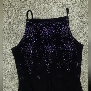 This stunning purple gown features a sleek halter neckline and a sleeveless design, perfect for making a statement at prom. The luxurious velvet fabric adds a touch of elegance, while the maxi length and double slit creates a graceful silhouette.