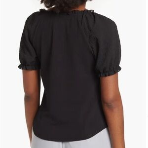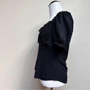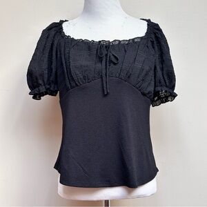 Brand new with tags (NWT) Status by Chenault black top featuring a sheer plaid overlay bodice. Perfect for a chic and sophisticated look. Size Small.