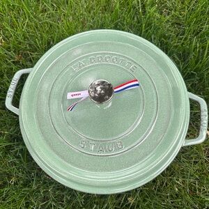 Premium cast iron Dutch oven by Staub. Ideal for slow cooking. Features a stylish mint green finish.