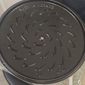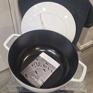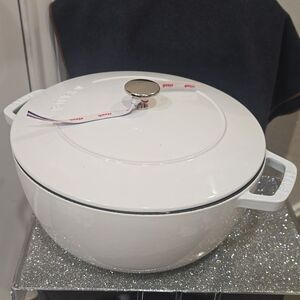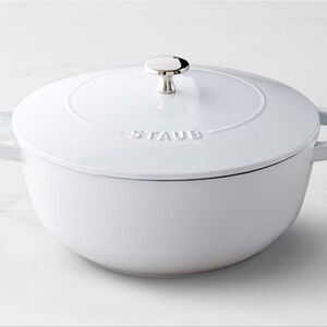 Premium cast iron Dutch oven by Staub. Ideal for slow-cooking. Elegant white finish.