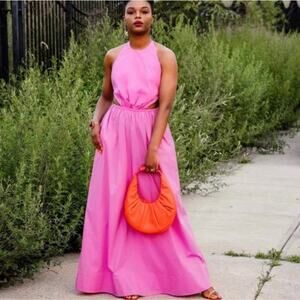 Elegant Pink Cotton Halter Gown: STAUD APFEL DRESS IN WILD ORCHID. Apfel is a full length pink poplin halter dress with an open back, featuring side cutouts for cheeky peeks of skin, two side pockets and A-line maxi length. Feel Fabulous in this Flirty, Fun & Fresh dress!