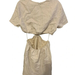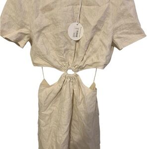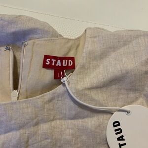 Elegant beige linen dress by Staud. Features a simple and classic design.