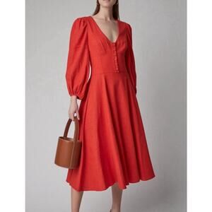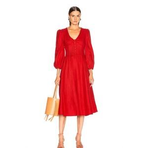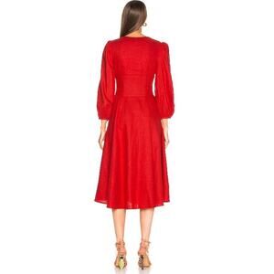 Staud Birdie Midi D Dress Red Linen Puff Sleeve Full Skirt bodice Button Front 6