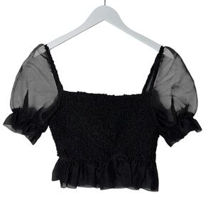 Lightweight pullover crop top featuring a smocked bodice, square neckline and sheer puff sleeves.