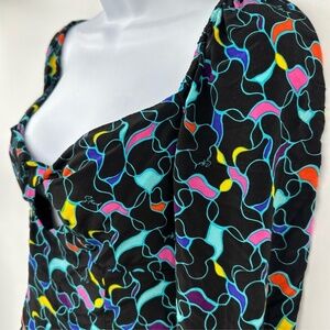Black printed crepe (65% Rayon, 35% Viscose). Top. Long sleeves. Sweetheart. Back button closure. 19" from shoulder to hemline. Imported
