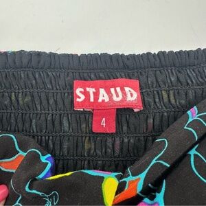 Staud | Blouse | 4. Runs small. Twist front with cutout. Elasticized shoulders. Button cuffs. Side zipper. Back has smocking for stretch. Torso is lined but not sleeves. 65% rayon and 35% viscose.