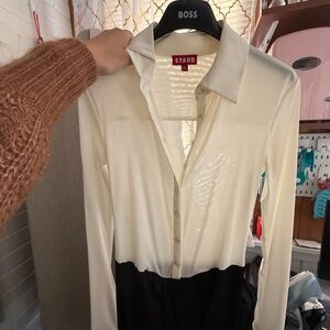 Chic long-sleeve dress by Staud. It’s gently used and in great condition. The material is a thick, high-quality mesh, so the top portion is a bit sheer, as shown in the photos. It’s very stretchy fabric.