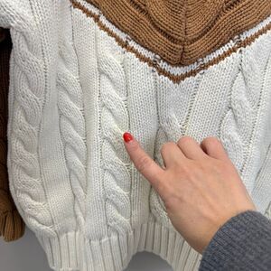 Gently used cable knit sweater in great condition. Tiny faint yellow spot on the front (see images). Hardly noticeable when worn.”