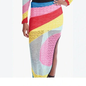 Staud Centre Rainbow Crochet Knit Asymmetric Linen Blend Midi Skirt