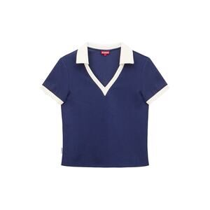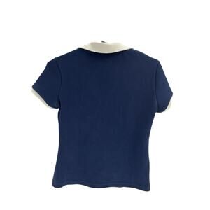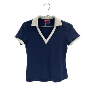 Staud Court Volley Blue Polyester Stretch Polo Top Size XS: a spread polo collar, sporty contrast trim completes this pull-on style, spread polo collar short sleeves pulls on, measurements: 17 inch bust x 21.5 inch length.