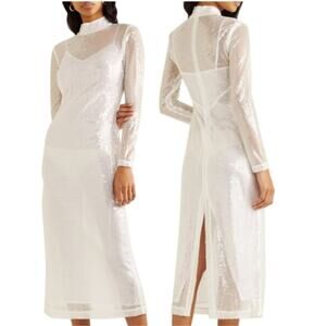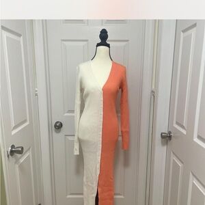 Chic long sleeve cream dress by Staud. Features a stylish neckline and ribbed texture. Perfect for elegant occasions. Very nice thick quality material. Bandaid like feeling.