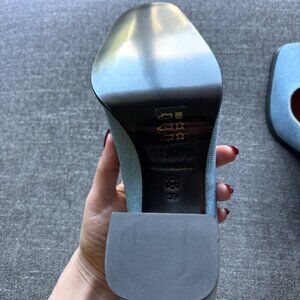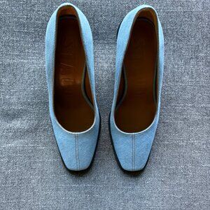 Staud Denim Paz Pump in Size 39. Great Condition. I bought from store and they are never worn. They have some very light scuffing on pump heel that makes it look a little more matte in certain light, but no discoloration. I showed in photos.