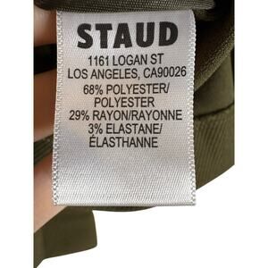 The Staud Division Mini Skirt in green brings a bold edge with its A-line silhouette and utilitarian-inspired details. A statement piece for modern streetwear styling, perfect for pairing with boots, sneakers, or structured tops.