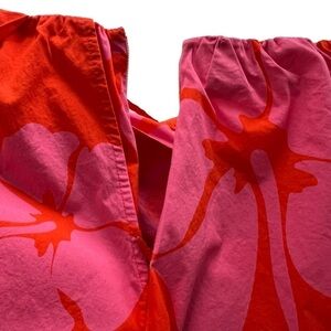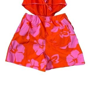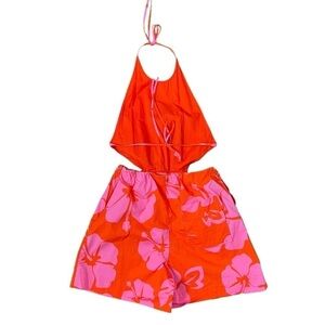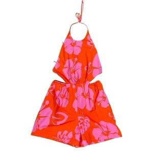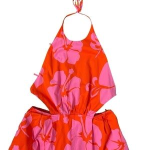 A poolside-ready playsuit, Staud's Georgia sleeveless romper is delicately tied along an open back in hibiscus floral cotton poplin. Hip slant pockets. Side zip closure. Partial elasticized waistband. Adjustable back tie closure and patch pocket. Halter neckline Side cutout details.