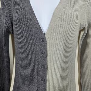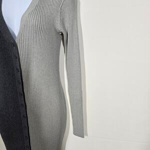 The Shoko Sweater color block midi-dress can be worn as a cardigan or dress. This two-tone style is made out of a stretchy, comfortable compact rib knit fabric