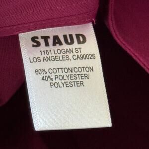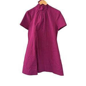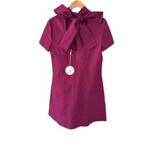 Staud Ilana Mini Dress in Syrah Purple. Size Large. Feature mid weight non-stretch weave fabric, oversized bow tie closure, mock neck, short sleeves, gathered yoke, open back, unlined, hidden back zip closure, and short mini length. 60% cotton, 40% polyester. Style: 141-7523A. NWT / New with tags. Retails $325.