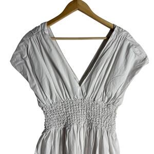 Staud Jackson White Smocked V-Neck Short Sleeve A-Line Midi Dress Size Large