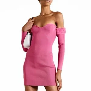 SO chic and so fun — the Josee Staud Mini Dress is a show-stopper with its off-shoulder long sleeves trimmed in faux fur and curve-hugging rib knit silhouette.
