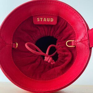 Authentic STAUD Keaton bucket bag in bold red leather with a sculptural, structured silhouette. Features a top handle, drawstring interior pouch, and signature modern design that STAUD is known for. A standout statement bag that elevates both day and evening looks.