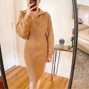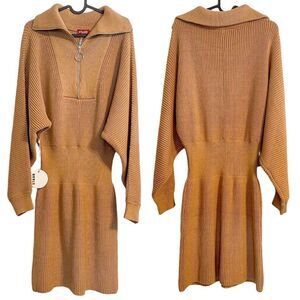 Features: long sleeves dolman sleeves with fitted cuffs, fitted waist, collar, partial front zip with ring pull, above knee length, fully ribbed, heavyweight knit, in camel