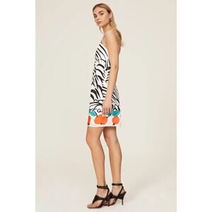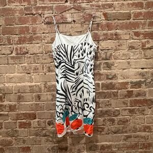 White printed polyester (100% Polyester). Sheath. Square neckline. Sleeveless. Side zipper closure. Imported.
