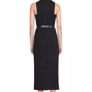 This fitted, sleeveless Sharmila midi-dress from STAUD features a crewneck, a thigh-high side slit, and contrast trim at the waist. This piece fastens with a back-zip closure.