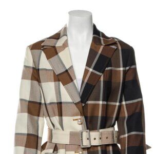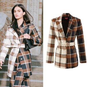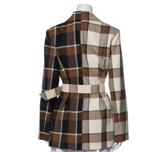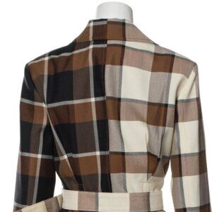 Classic blazer cut from two different plaid colorways. Structured lightly padded shoulders with a front pearl button closure. Two roomy side pockets. Includes a matching belt. Lined.