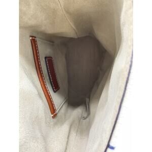 Staud 'Phoebe' Green Canvas Convertible Bucket Bag: silver-tone hardware, leather trim, striped pattern, structured silhouette, fold-over flap with magnetic closure, card slot at interior, interchangeable handle and crossbody strap, suede lining.